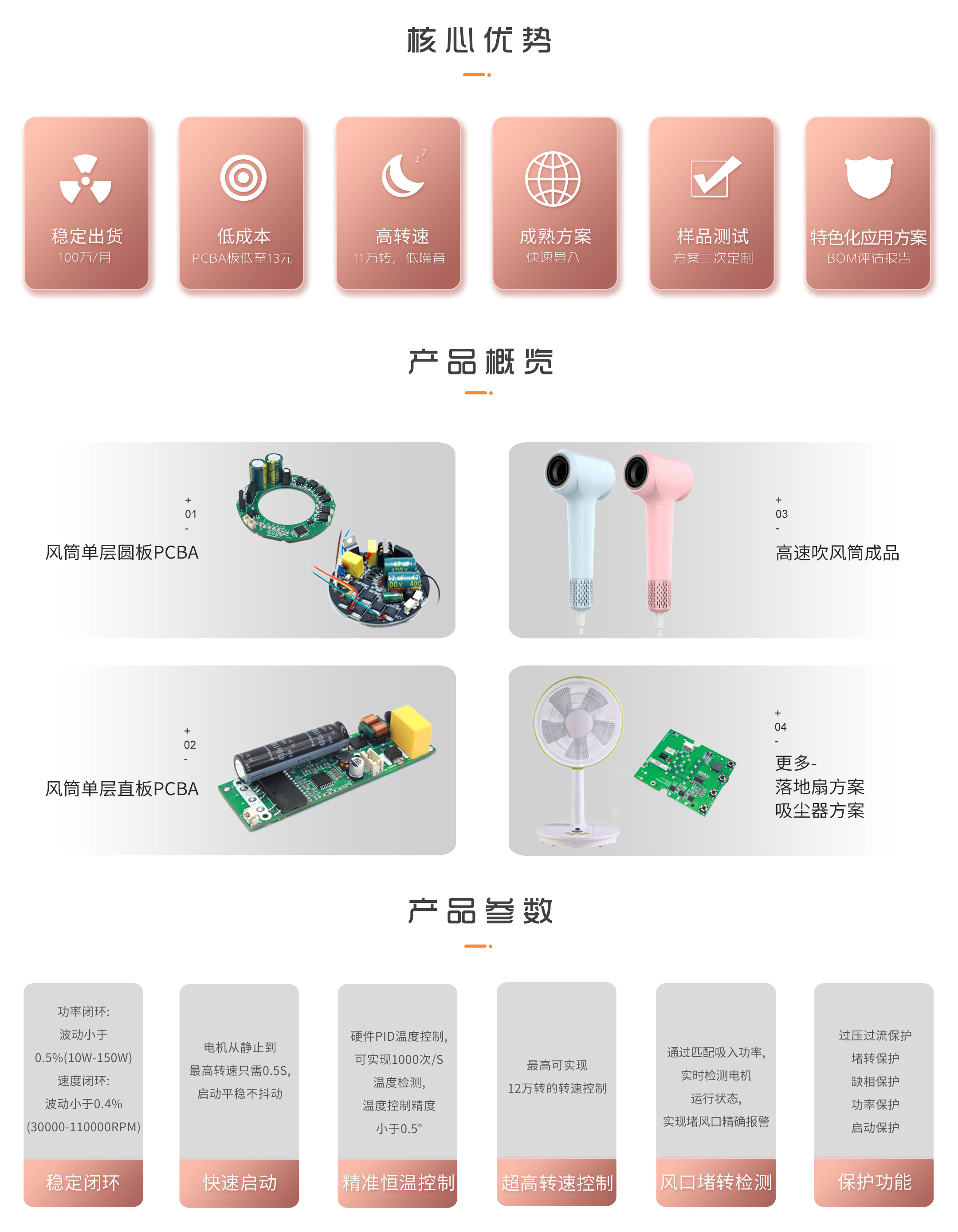 我司英尚微電子提供的高速吹風機方案,每分鐘轉速高達11萬轉,是普通吹風機的5倍,能夠產生高速、高壓的強勁風力。強勁的氣流快速吹干,恒溫不傷頭發,無刷電機可以滿足風筒對各種轉速的精確控制和應用集成的需求。英尚微電子可以根據客戶需求快速定制符合客戶需求的電機方案。詳情及更多應用方案,歡迎垂詢137-5119-2923