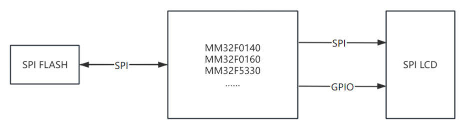 靈動(dòng)微推出的SPI LCD顯示參考方案,通過SPI接口讀取外部SPI FLASH存儲(chǔ)芯片中存儲(chǔ)的字體、圖片等數(shù)據(jù)資源,再通過另外一路SPI驅(qū)動(dòng)SPI LCD彩屏顯示。對(duì)于不同尺寸、不同分辨率的 SPI LCD 彩屏,客戶可以選擇靈動(dòng)微電子不同規(guī)格的MCU來實(shí)現(xiàn)刷屏效果,硬件設(shè)計(jì)框圖如下所示: