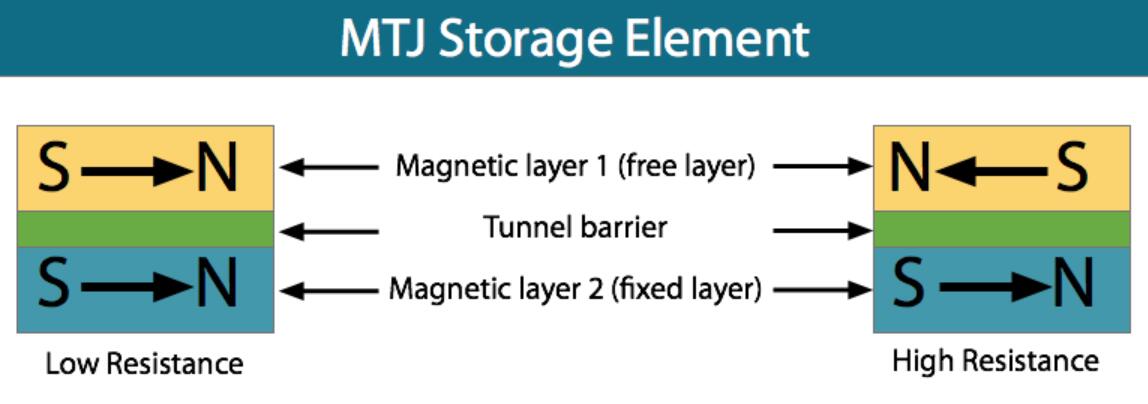 當(dāng)自由層的磁矩平行于固定層時,MTJ器件具有低電阻,而當(dāng)自由層磁矩與固定層矩反平行時,MTJ器件具有高電阻。
