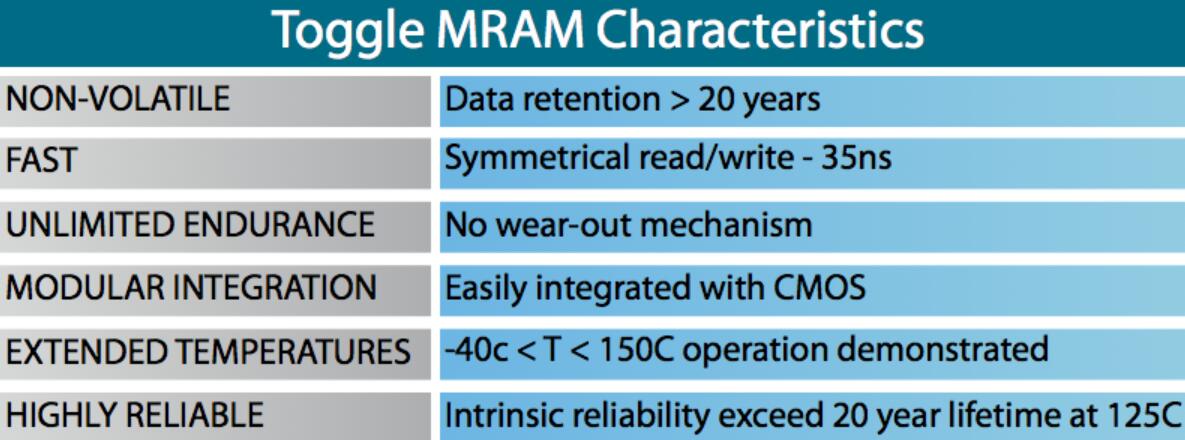 切換MRAM使用1個晶體管,1個MTJ單元來提供簡單的高密度存儲器。Everspin使用獲得專利的Toggle電池設(shè)計,可提供高可靠性。數(shù)據(jù)在溫度下20年始終是非易失性的。
