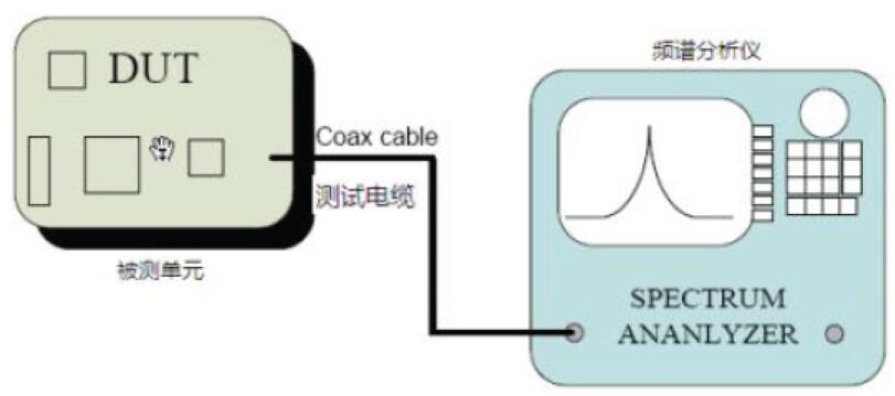 射頻發(fā)射信號通過產(chǎn)品的天線耦合到頻譜分析儀。測試裝置連接如下: