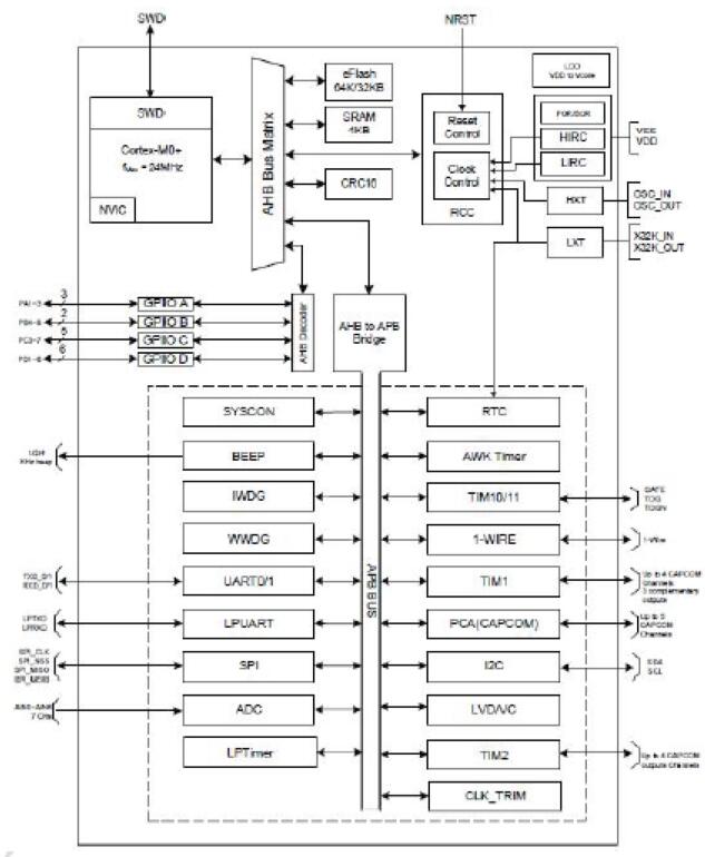 - 32 位ARM®Cortex-M0+處理器內核,最高工作頻率可達24MHz