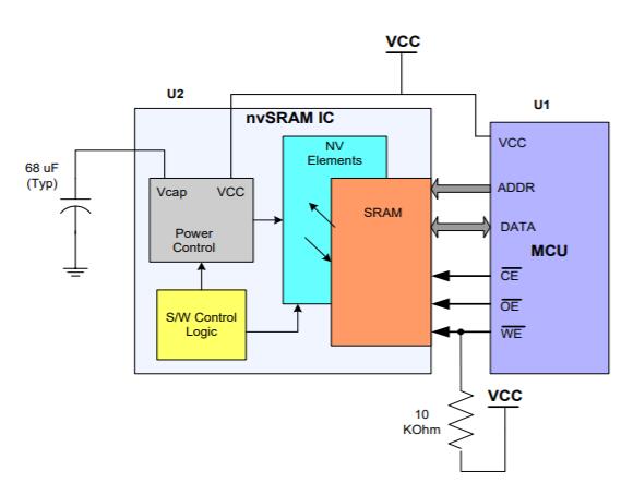 高速SRAM單元提供了非常高速的讀寫訪問,并且可以像標準SRAM中一樣無限次地寫入或讀取NV-SRAM。如果斷電則利用存儲在與NV-SRAM的VCAP引腳相連的小電容器中的電荷將SRAM中保存的數據傳輸到與每個SRAM單元集成的非易失性元件。 NV-SRAM VCAP引腳上需要的電容器只有幾十µF,典型值為68 µF(有關VCAP的允許范圍,并在上電期間通過內部充電電路進行充電。 VCAP上存儲的電荷足以在掉電期間將SRAM數據復制到非易失性元件(稱為存儲操作)。