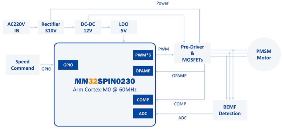 MM32SPIN0230為主控的低成本無刷高速吹風(fēng)機(jī)單片機(jī)方案。