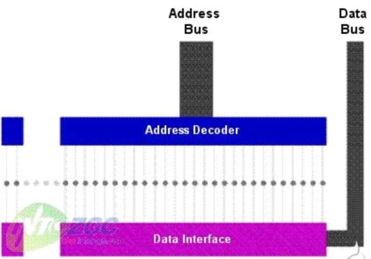 上圖中的小圓點代表RAM中的存儲空間,每一個都有一個唯一的地址線同它相連。當地址解碼器接收到地址總線傳送來的地址數據之后,它會根據這個數據定位中央處理器想要調用的數據所在的位置,然后數據總線就會把其中的數據傳送到中央處理器。