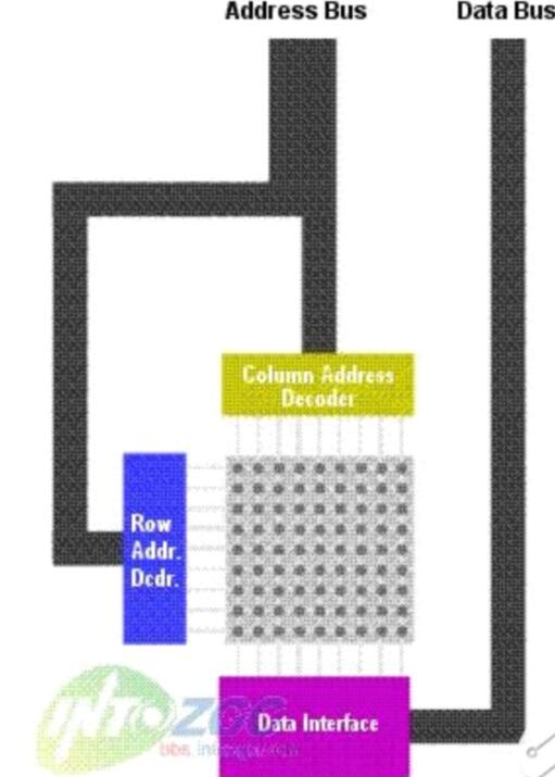 如果RAM對于CPU來說僅僅是一條“線”的話,還不能體現實際的運行情況。因為如果實際情況真的是如此的話,在實際制造芯片的時候,會有很多實際的困難,特別是在需要設計大容量的RAM的時候。所以一種更好的能夠降低成本的方法是讓存儲信息的“空格”排列為很多行--每個“空格”對應一個bit存儲的位置。如果要存儲1024bits(2^10)數據,那么你只要使用32x32(2^5*2^5=2^10)的矩陣就能夠達到這個目的了。很明顯一個32x32的矩陣比一個1024bit的行設備更緊湊,實現起來也更加容易。請看圖2.