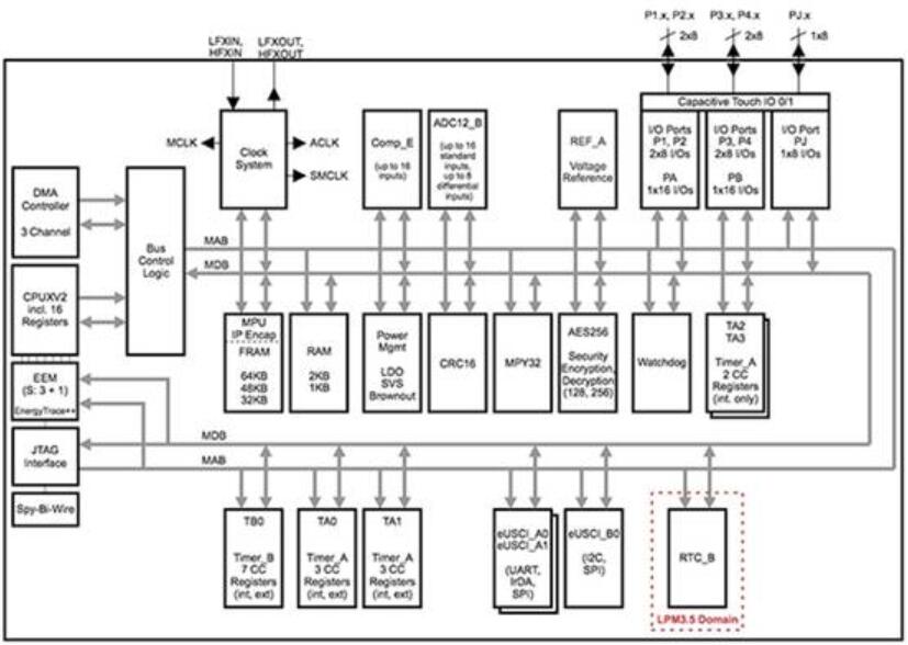 圖2:德州儀器MSP430FR5969 MCU結合周邊的全套帶有片上FRAM存儲器,而只需要100μA/ MHz有源模式電流和顯著少帶了多個低功耗模式(LPM)。 (德州儀器提供)